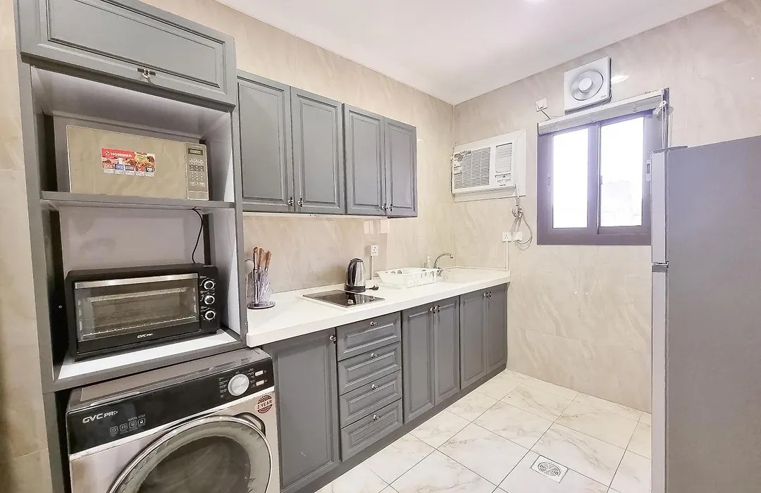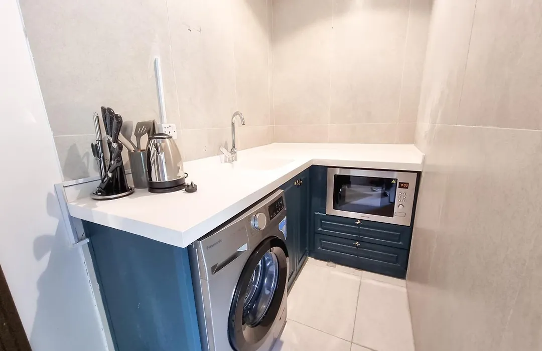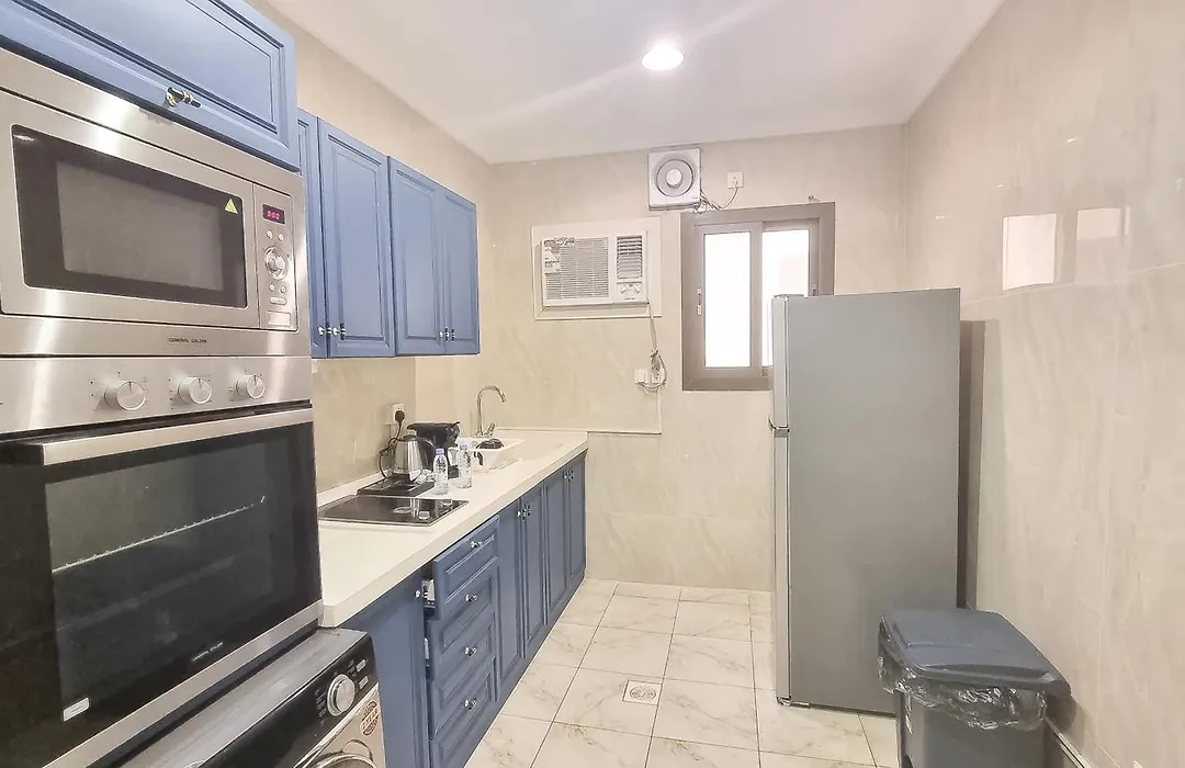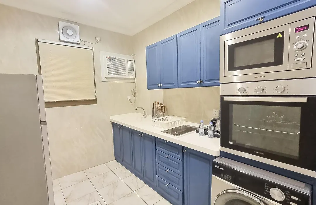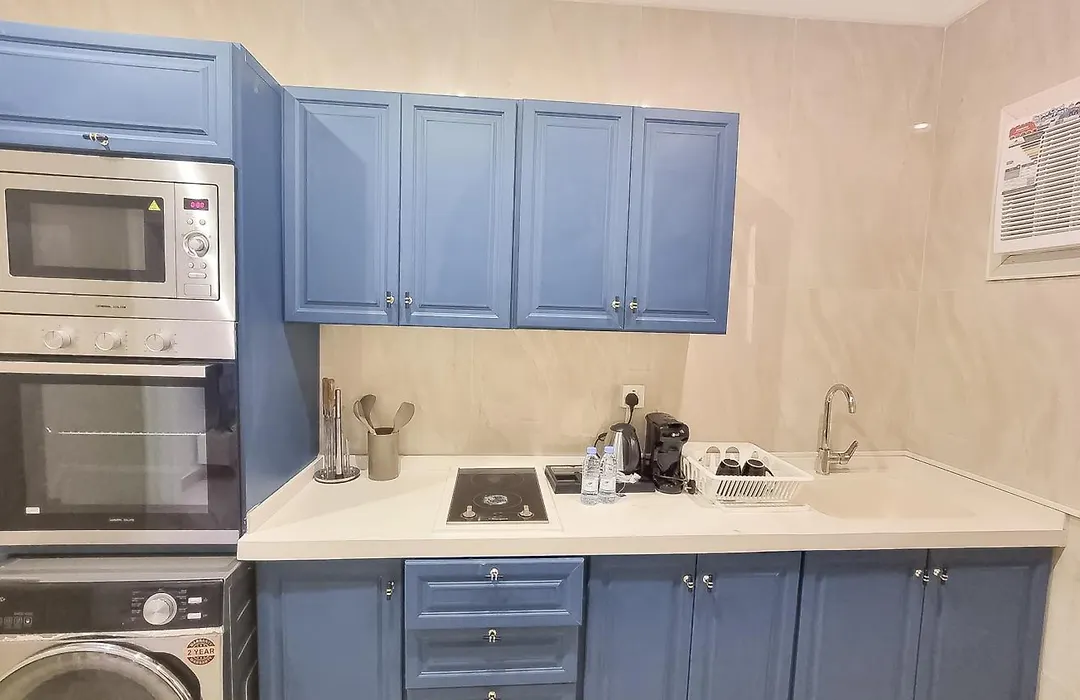 تضمّ الشقة لوازم إعداد القهوة والشاي والمطبخ الكامل مع الغلاية الكهربائية والمجمدة والفرن.